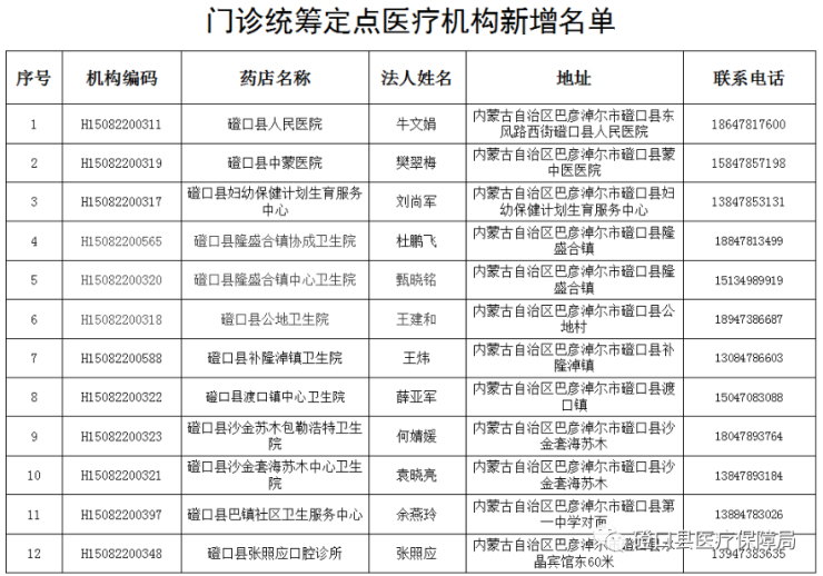 为满足广大参保患者就医需求,便捷医保结算,根据《关于增加定点医疗机构医保结算业务的通知》(巴医保办字〔2023〕15号)、《巴彦淖尔市职工基本医疗保险门诊共济保障实施细则》(巴医保发[2022]40号)、《关于规范和完善门诊特殊用药管理的通知》(巴医保发[2021]37号)文件要求,磴口县医疗保障局现对以下12家开通的门诊统筹定点医疗机构进行公示。