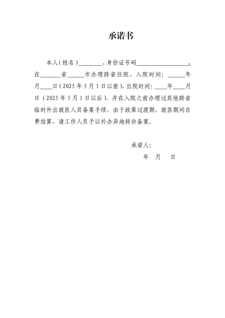 巴彦淖尔市参保人员:根据《转发自治区医保局 卫生健康委员会关于印发<内蒙古自治区基本医疗保险跨省异地就医转诊实施办法(暂行)的通知>的通知》(巴医保办发[2025]28号)文件要求,自2025年5月1日起,办理其他跨省临时外出就医备案人员,在跨省异地转诊就医人员的支付比例基础上降低10%。(具体内容详见此链接:跨省异地就医新政将于5月1日落地执行)为保障我市参保人员的权益,对在5月1日之前在省外办理住院,并在5月1日以后办理出院的其他跨省临时外出就医人员,可先行自费结算,在参保地医保经办窗口补办异地转诊手续(出具书面承诺书),在参保地医保经办窗口进行报销;如果在省外已经办理异地直接结算,则不再进行报销。