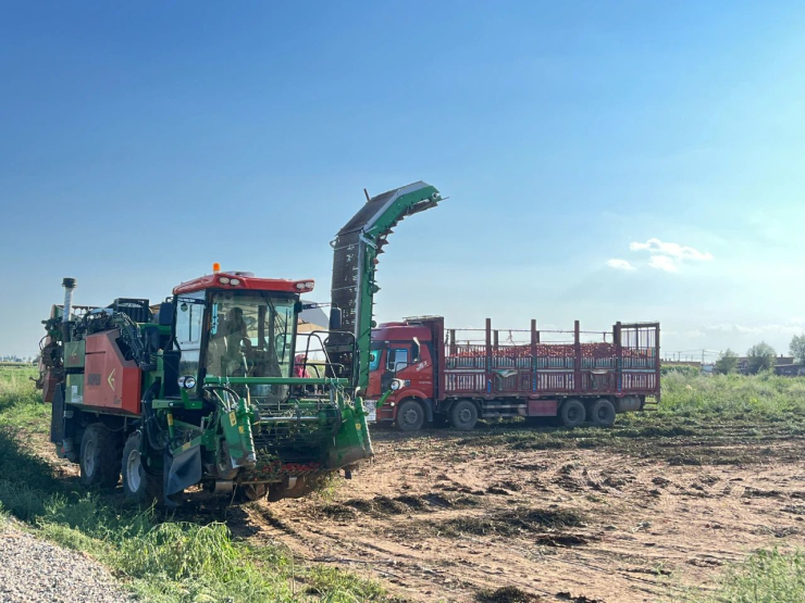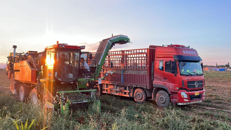 近日,隆盛合镇海岗村的番茄已进入成熟期,在丰收的田野上,海岗村的机产番茄正以其独特的魅力,绽放出耀眼的光芒,番茄采收机与拉运车密切配合,在田间穿梭,转眼间就将番茄装满车厢,现场一派喜人的丰收景象。