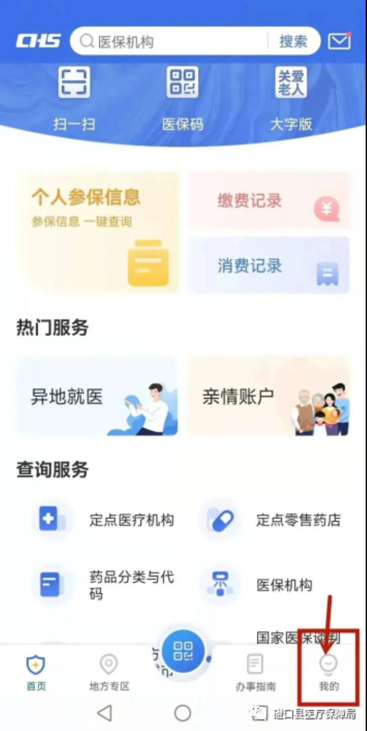 第二步、登录“国家医保服务平台”APP,进入主界面,可以点击右下角“我的”。