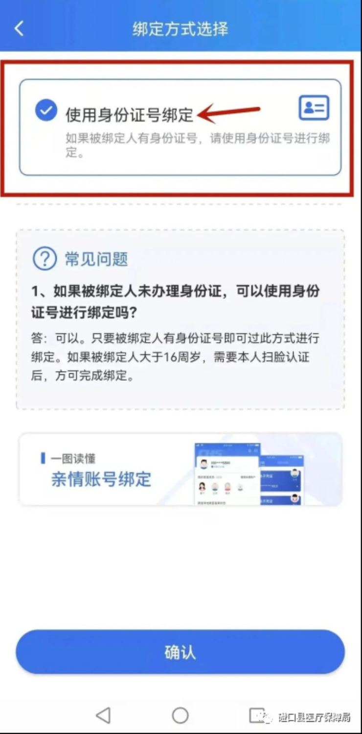 第四步、进入“绑定方式选择”界面后要选择“使用身份证号绑定”,点击“确认”。