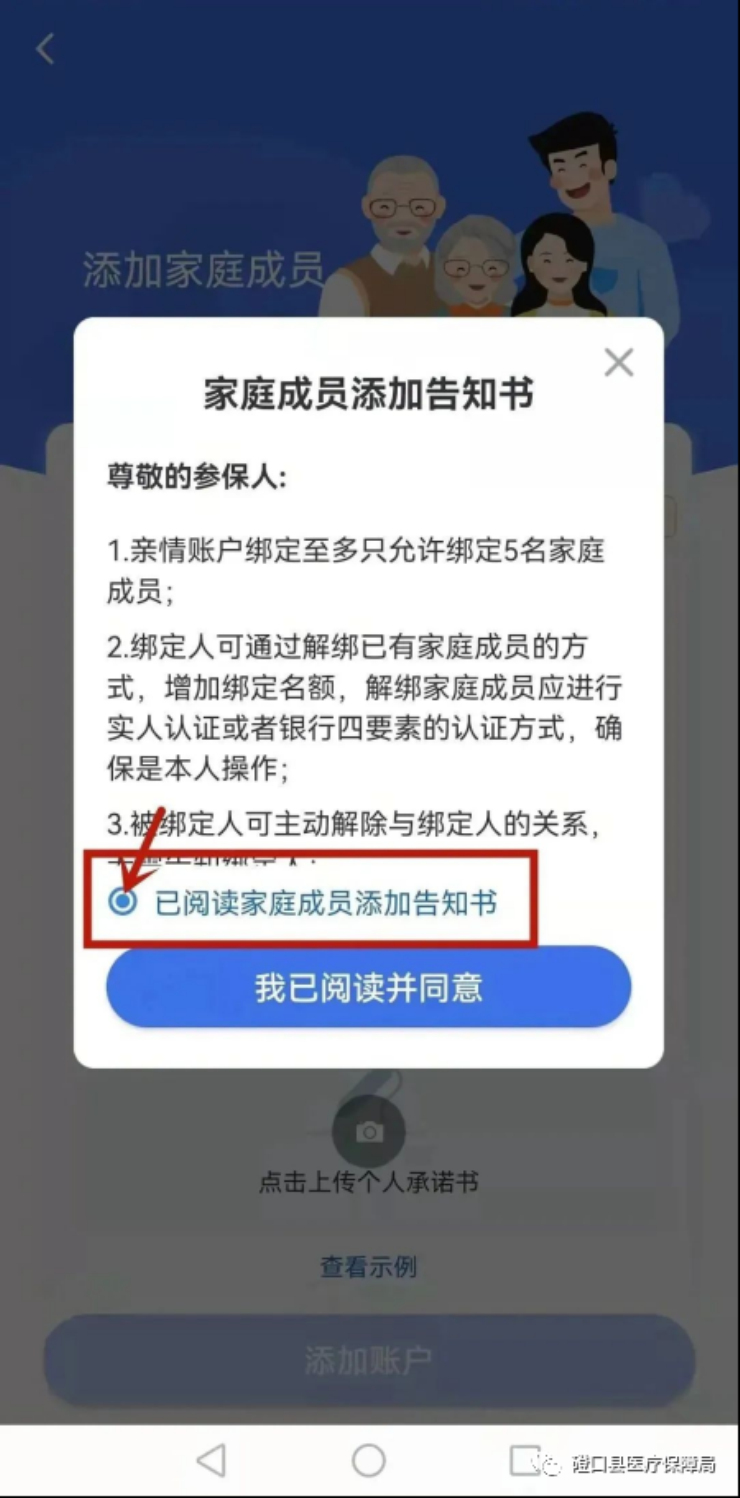 第五步、之后会进入“家庭成员添加告知书”界面,阅读并同意后,选择“已阅读家庭成员添加告知书”,点击“我已阅读并同意”。