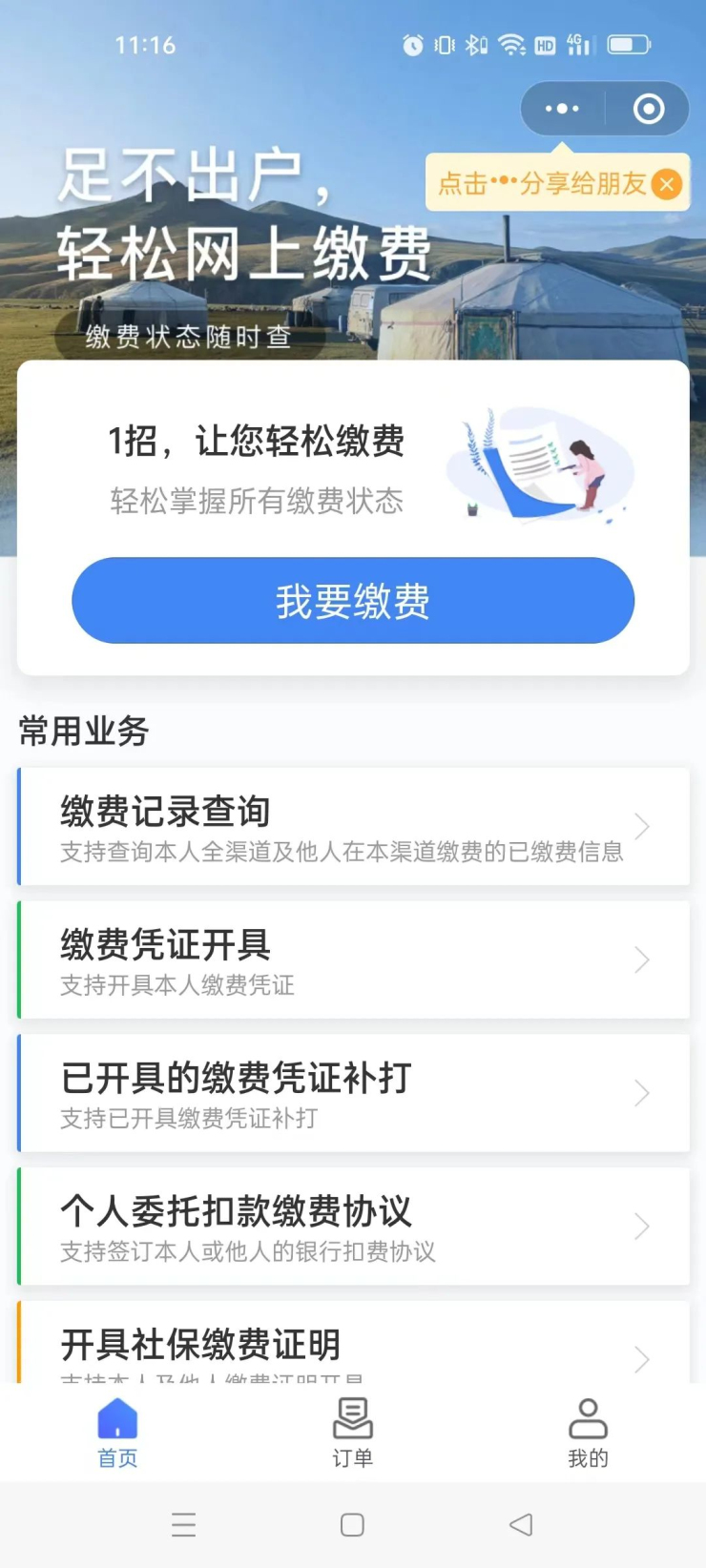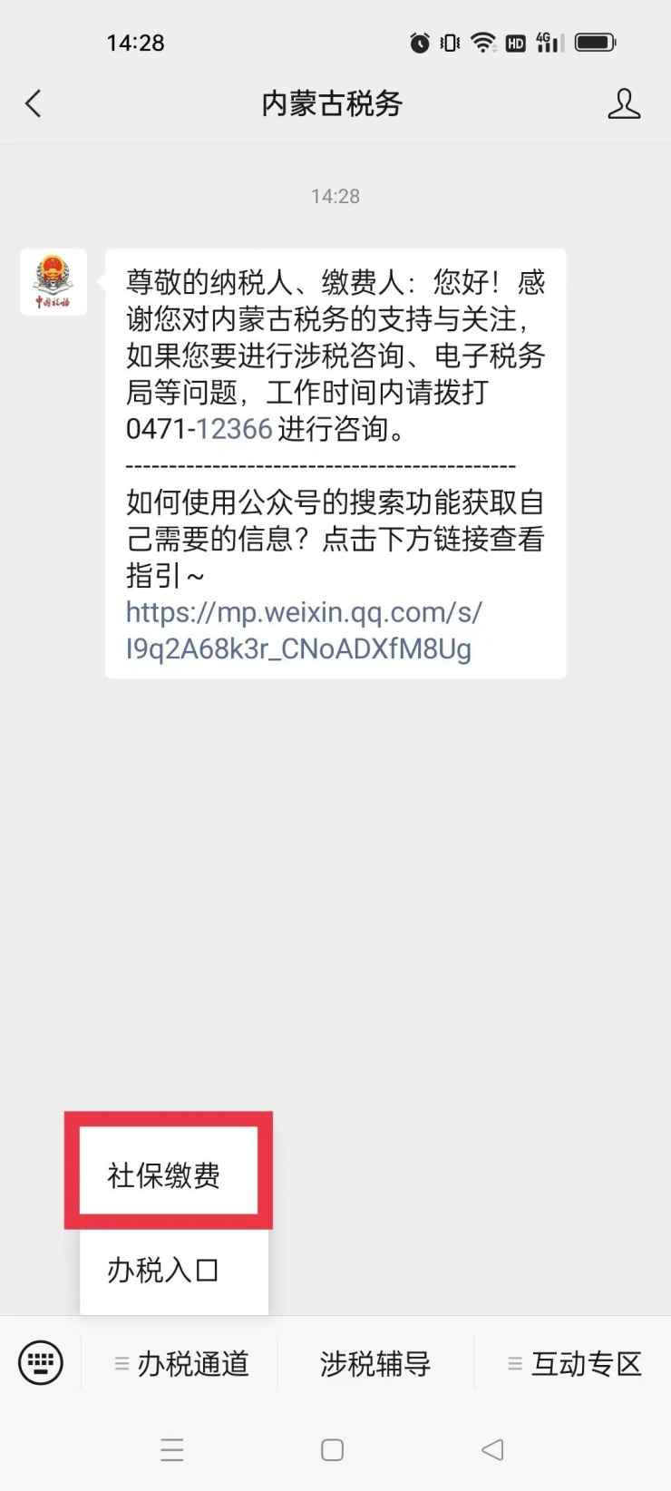 1.打开微信,搜索“内蒙古税务”并关注,点击底部模块“办税通道”——“社保缴费”