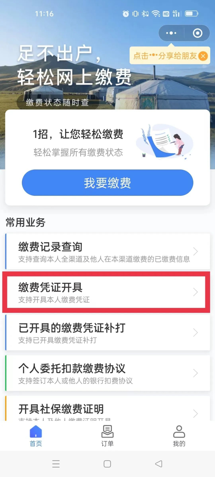 2.进入“内蒙古税务社保缴费小程序”后,点击“缴费凭证开具”;