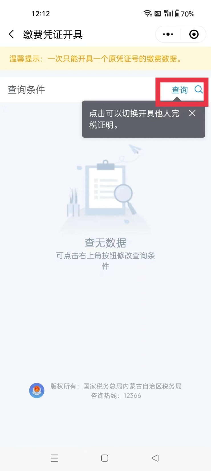 3.进入“缴费凭证开具”后,点击“查询”;(提示:一次只能开具原凭证号的缴费数据)