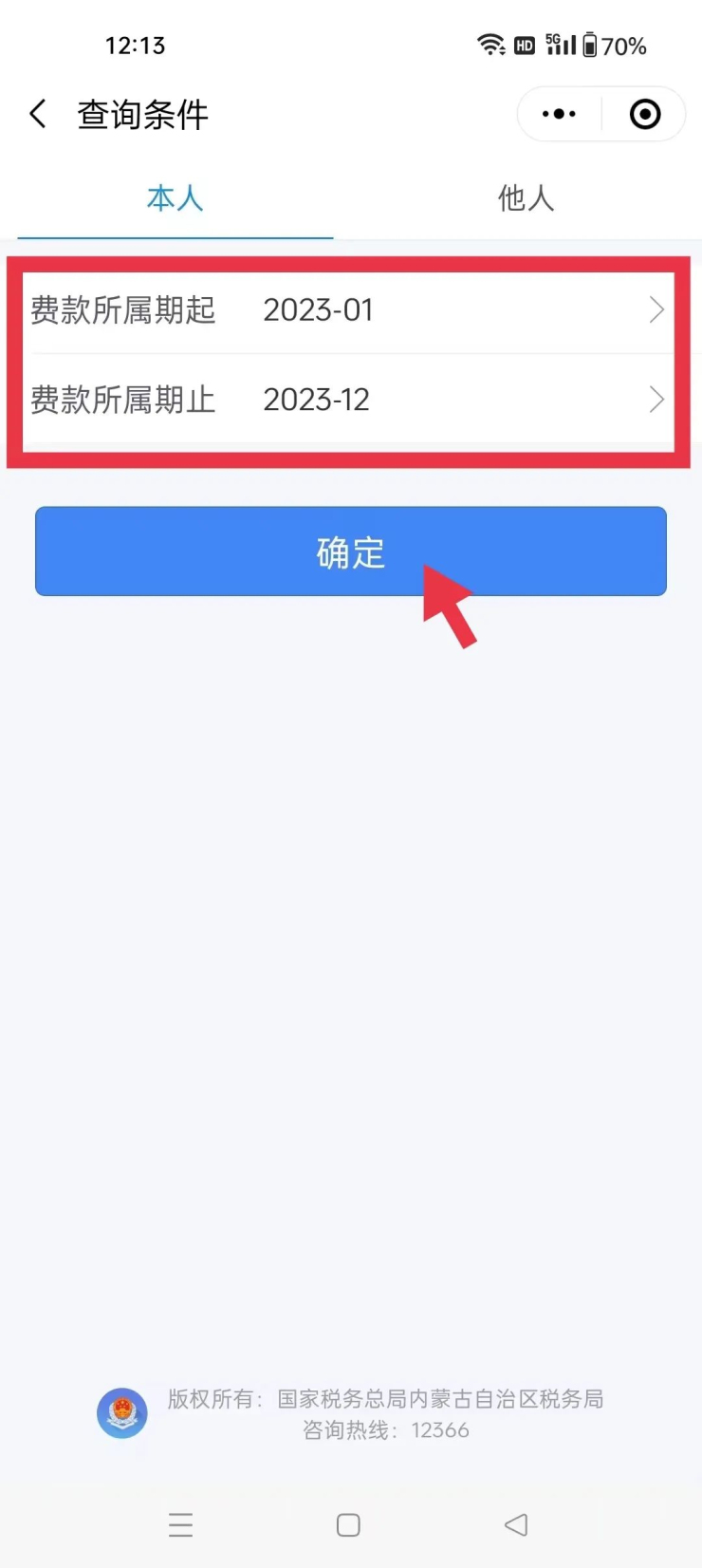 4.进入后默认“本人”模块,选择“费款所属起”和“税款所属期止”,点击“确定”;