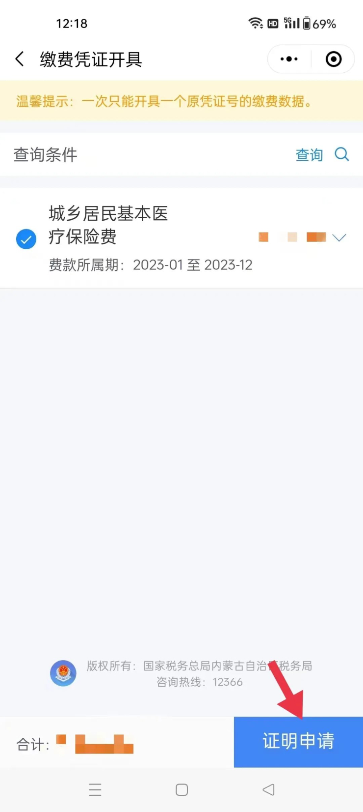 3.选择“城乡居民基本医疗保险费”,并点击“证明申请”;