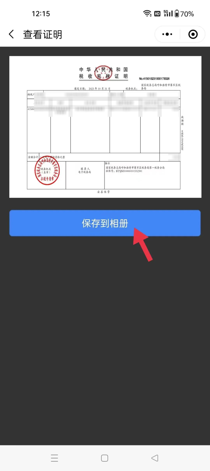 6.点击“保存到相册”,该证明会以照片的形式保存到手机相册中,完成开具。