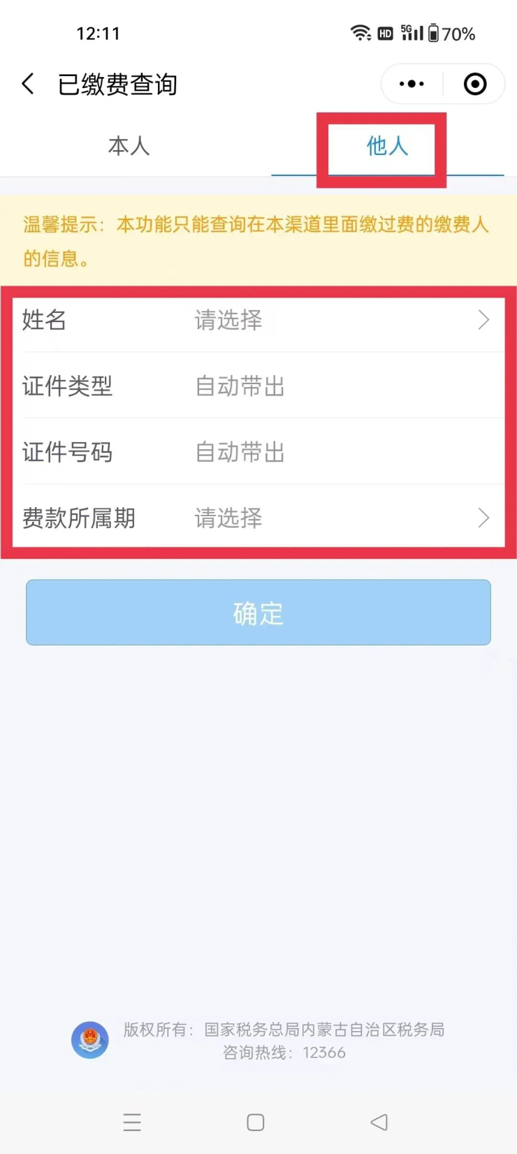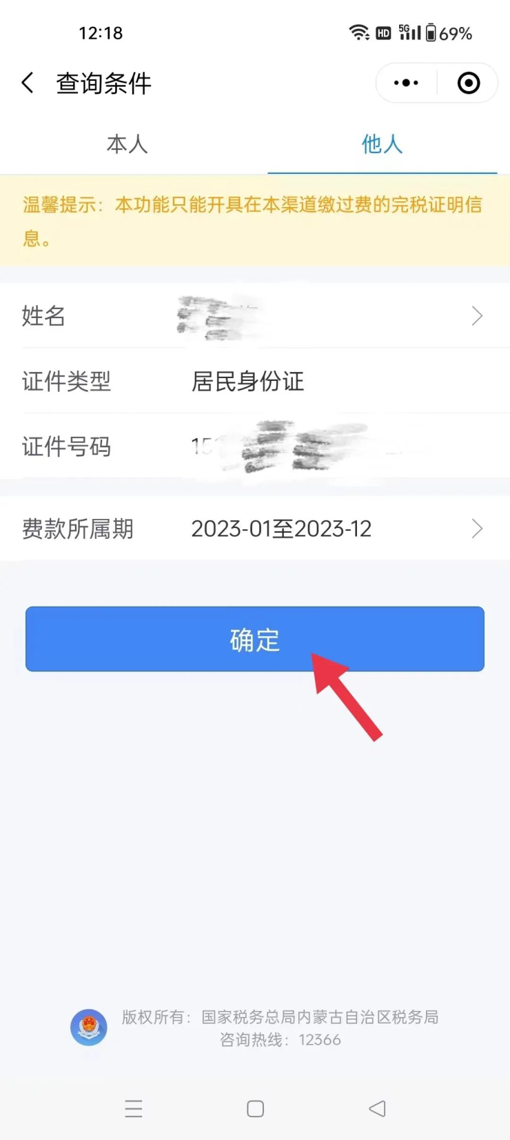 2.选择“姓名”后,自动带出“证件类型”和“证件号码”,选择“费款所属期”,点击“确定”;