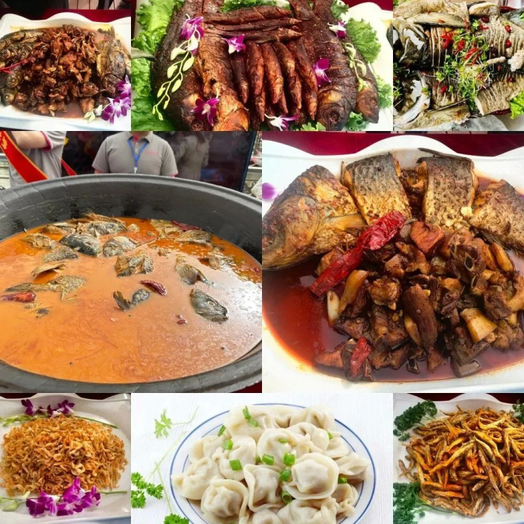 磴口县依傍黄河,黄河鲤鱼居中国四大淡水鱼之首,黄河鲶鱼又是黄河里较为珍贵的鱼种,全鱼宴席上,有熏制、干炸和油焖鱼,有水煮、清炖、红烧鱼,有利用鱼片烹饪的各类菜肴,也有鱼肉水饺、包子,更有鲜美的鱼骨汤……整个席面上色彩斑斓,琳琅满目,浓香萦绕,回味无穷。