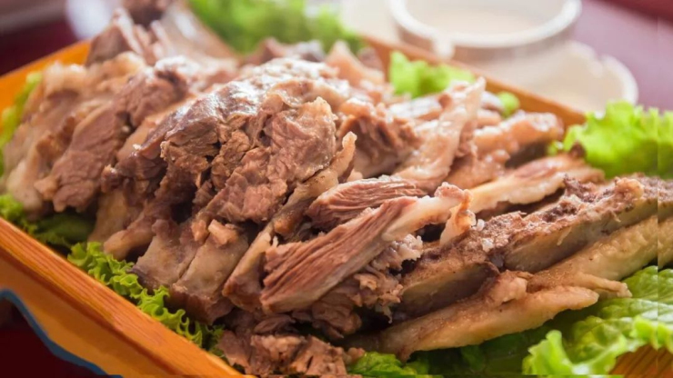 手扒肉是蒙古族招待客人时较为常见的一道特色美食。其做法是将全羊按骨节拆开,这样肉里就不会有骨头渣,然后白水下锅,只放咸盐,不加任何佐料,原汁烹煮,水沸后即出锅,肉味香美,鲜嫩异常。吃时,要用蒙古刀割、刮、剔,再用手扒着吃,故名“手扒肉”。