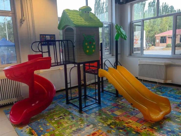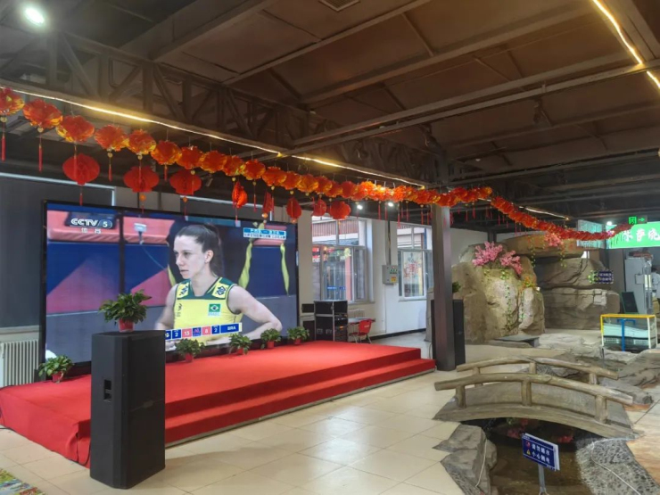 于小溪相对应的是一排环抱式的小吃摊位,中间是宽阔的就餐区,舞台大屏和儿童娱乐区。