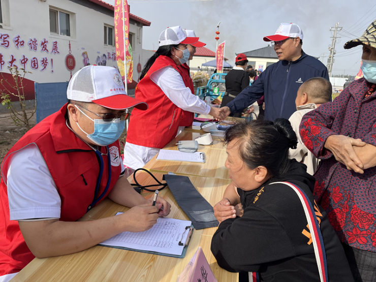 9月22日上午,在第6个中国农民丰收节来临之际,磴口县人民医院派出医疗专家团队一行8人走进补隆淖镇坝楞新村开展健康义诊活动。在义诊活动现场,前来应诊咨询的农牧民络绎不绝,医务人员为他们免费测血压、测血糖,耐心细致解答群众提出的健康咨询问题,对农牧民常见病、多发病的预防治疗进行科普宣传和健康指导。