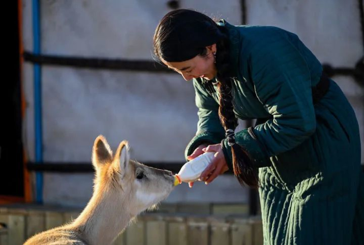 内蒙古锡林郭勒盟苏尼特左旗的蒙古族牧民乌伊汗给小黄羊“蹦泼来”喂牛奶(2022年1月13日摄)。新华社记者 连振 摄