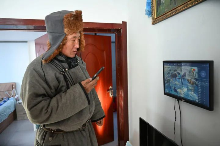 内蒙古呼伦贝尔市陈巴尔虎旗的牧民额尔敦达来在家中通过监控查看牲畜情况(2023年12月16日摄)。新华社记者 贝赫 摄