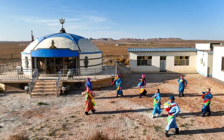 乐队成员在内蒙古鄂尔多斯市鄂托克旗牧民道尔吉的蒙古包前跳舞(2023年10月16日摄,无人机照片)。新华社记者 贝赫 摄