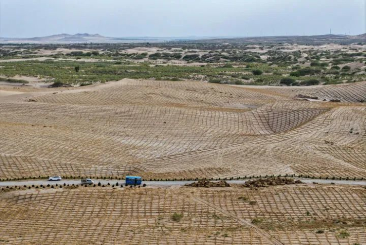 在内蒙古赤峰市翁牛特旗其白线防沙治沙项目区,穿沙公路将沙地切割,沙丘被逐步固定(2024年5月16日摄,无人机照片)。新华社记者 连振 摄