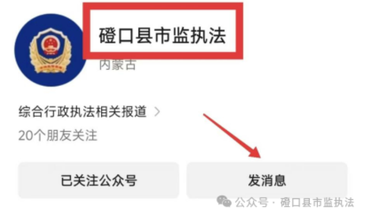 1. 进入【磴口县市监执法】微信公众号,点击【发信息】