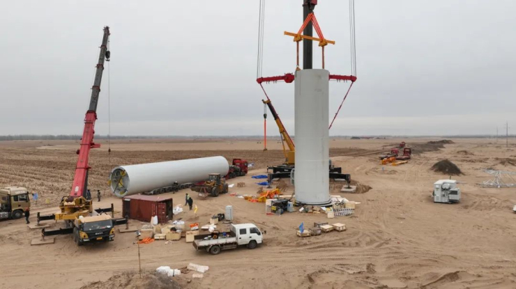 近日,在远景能源景泰新能源磴口县沙金套海苏木48兆瓦分散式风电项目的施工现场,已经装好的两台风机矗立在茫茫沙漠区域,运送大件的板车陆续进场,第三台风机的塔桶正在紧张吊装,整个工程项目加速建设,向着年底竣工的目标冲刺。