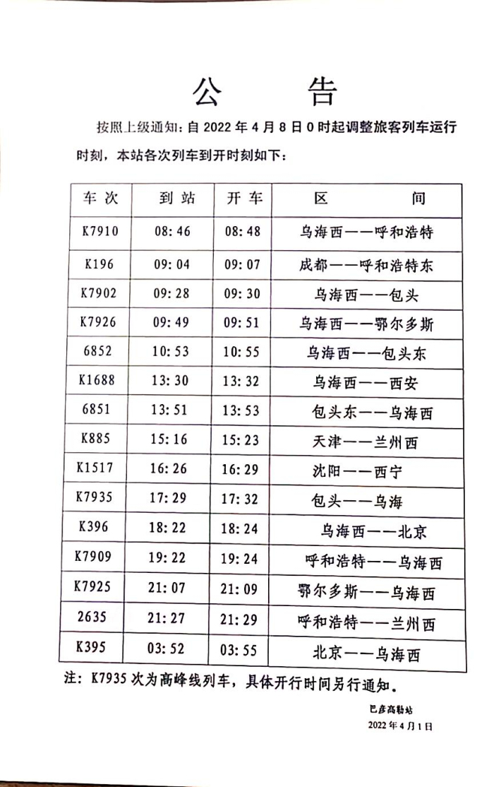 【公共交通】巴彦高勒镇火车站2022年最新列车时刻表