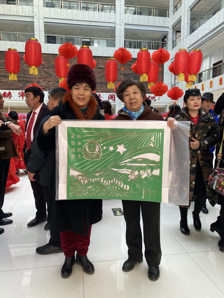 活动现场剪纸非遗传承人李爱珍、谢爱兰两位老师向在场群众介绍磴口县的剪纸非遗文化,一幅幅充满美好寓意的剪纸作品让大家体会到了传统文化的魅力。非遗“活了”年味也就“浓了”。