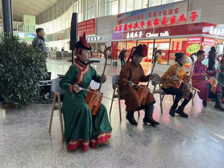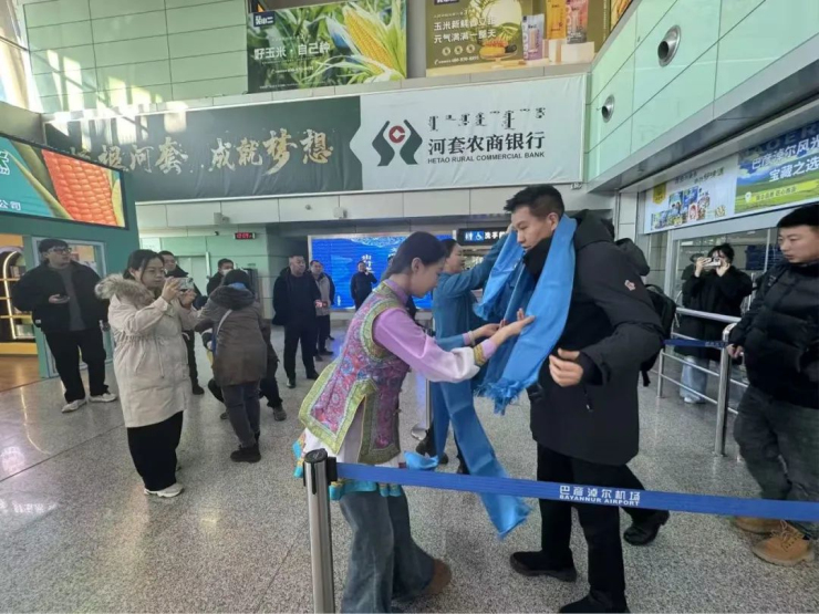 为促进文旅融合,助力“歌游内蒙古”品牌建设,1月7日上午,磴口县乌兰牧骑走进巴彦淖尔市天吉泰机场开展“歌游内蒙古”欢迎回磴口过年主题活动,让游客在歌声相伴的旅程中领略内蒙古的自然之美、四季之韵、天籁之音。“歌游内蒙古”旅游品牌口号是“歌声相伴 愉悦旅行”。磴口县乌兰牧骑的演员们用悠扬的马头琴旋律拉开帷幕,用激情的歌声和热情的哈达迎接八方来客,让在外打拼的游子感受到回家的温暖,欢快的蒙古族舞蹈点燃现场氛围,一副热热闹闹回家过年的节日气氛。往来旅客在观看的同时,纷纷拿起手机记录下出行中的欢快时刻。
