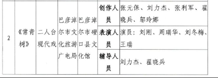 其中由巴彦淖尔市文化旅游广电局报送,磴口县文化馆作为演出单位的二人台现代戏《常青树》获戏剧类入围作品。