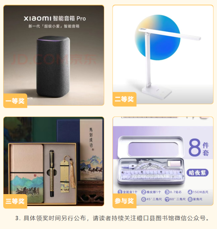 1. 活动作品排名以线上投票数为准,系统自动评出,每个微信号每日可投 10 票,欢迎读者积极转发分享,让更多人感受春节年俗文化魅力;2. 活动设:一等奖 1 名,价值300元小米智能音箱Pro一台,二等奖2名,价值150元华为智能护眼灯一台,三等奖3名,价值80元笔记本签字笔套装一套,参与奖 10名,价值15元圆规尺子8件套一套;一等奖二等奖三等奖参与奖3. 具体领奖时间另行公布,请读者持续关注磴口县图书馆微信公众号。