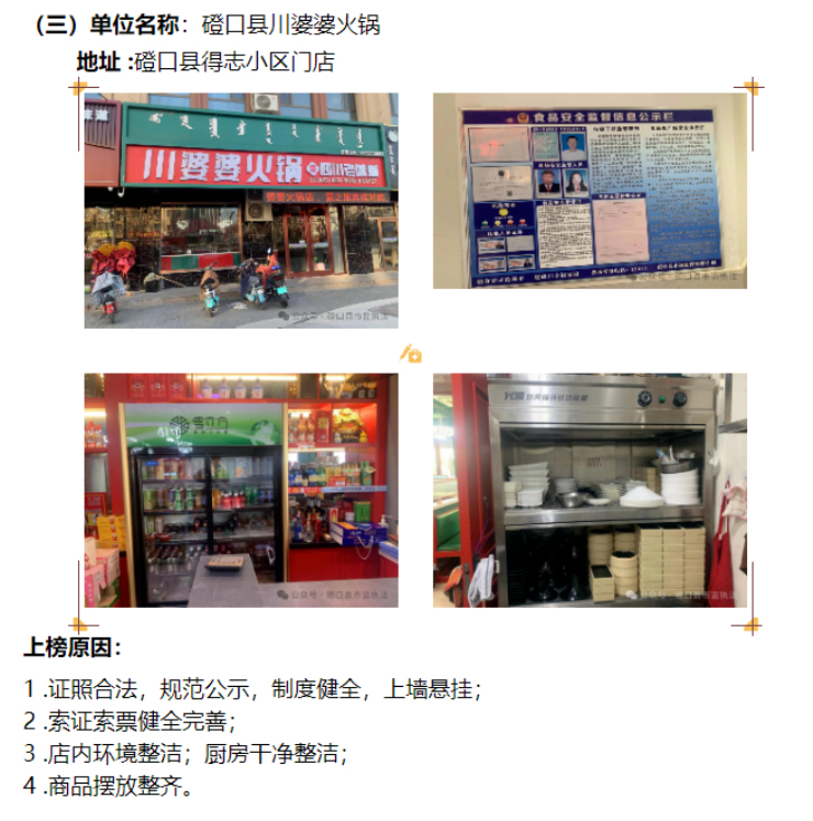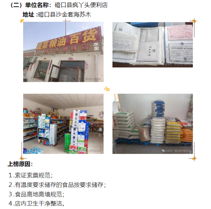 为进一步提升食品安全保障水平和监管效能,督促食品生产经营者全面履行主体责任,营造全民参与监督社会共治管理食品安全的良好氛围,提升食品安全保障水平和监管效能,磴口县市场监督管理局发布食品安全“红黑榜”(第十三期),3家食品经营单位登上“红榜”,2家食品经营单位列入“黑榜”,下面,快来看看哪些单位榜上有名!