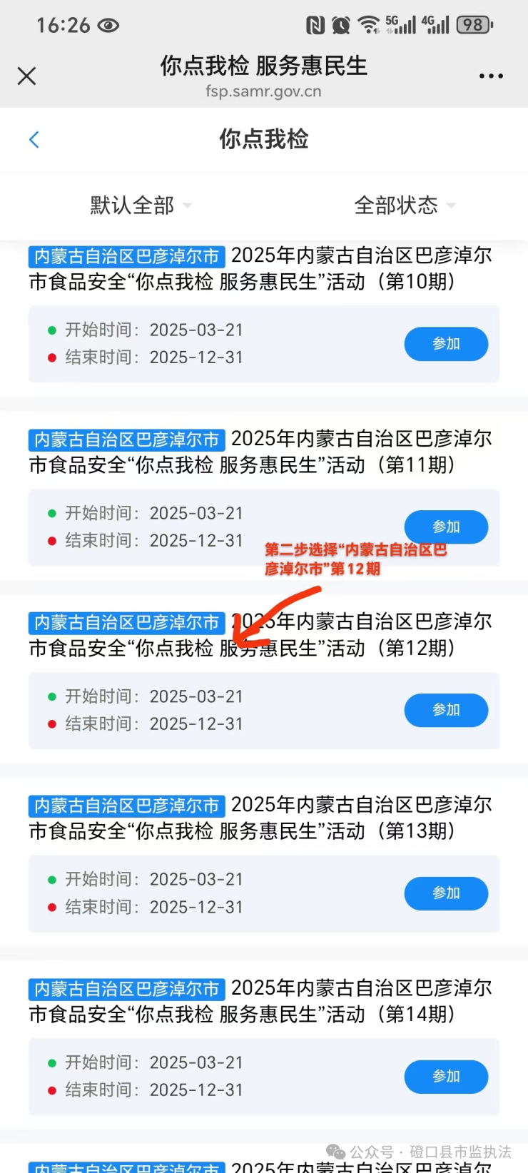 食品安全“你点我检 服务惠民生”民意征集系统已经上线,这是国家管理总局为提升食品安全监管效能、积极回应公众关切、全力满足群众期盼而推出的一项创新举措。磴口县市场监督管理局诚邀您参与食品安全“你点我检 服务惠民生”意见征集活动,一年365天,每天24小时,大家都能随时点选自己关心、关注以及希望政府部门抽检的食品。现在请大家参与第十二期“你点我检 服务惠民生”民意征集活动(请按步骤操作选第十二期)。
