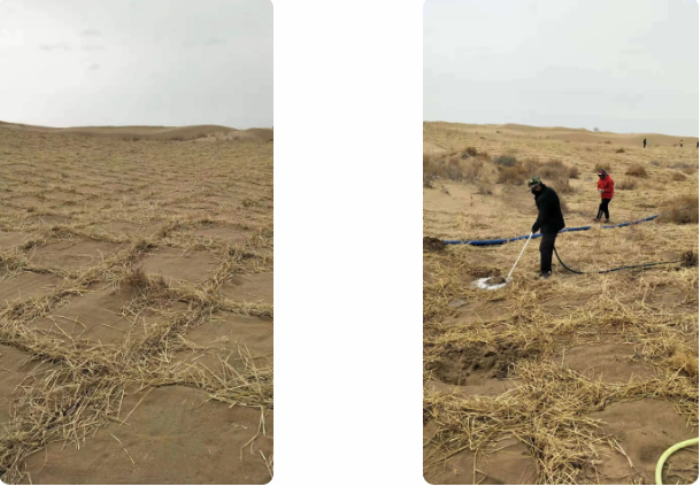 3月22日,在乌兰布和沙漠腹地,看到一棵棵梭梭苗在草方格里安家落户了。一条条“绿带”顺着纵横交错的草方格延向连绵起伏的沙丘,随风向人们点缀着头,向人们倾诉着喜悦的心情。在造林现场,工人师傅们有的拿着水管高压水打孔,给梭梭苗盖房;有的抱着梭梭苗,给梭梭苗搬家;有的拿着铁锹覆土,给梭梭苗固家。整个造林现场,工人师傅们干得热火朝天,但又井然有序。