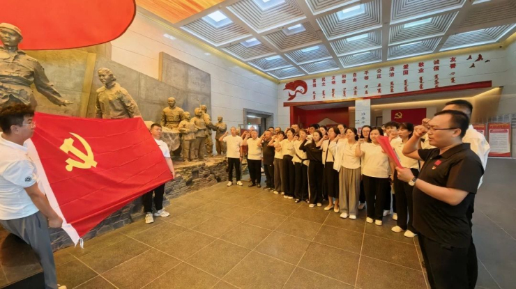 抵达五原县内蒙古抗日战争纪念馆后,庄严肃穆的氛围扑面而来,全体人员前往英雄纪念碑,整齐列队,高举右手,重温入党誓词,践行初心使命。