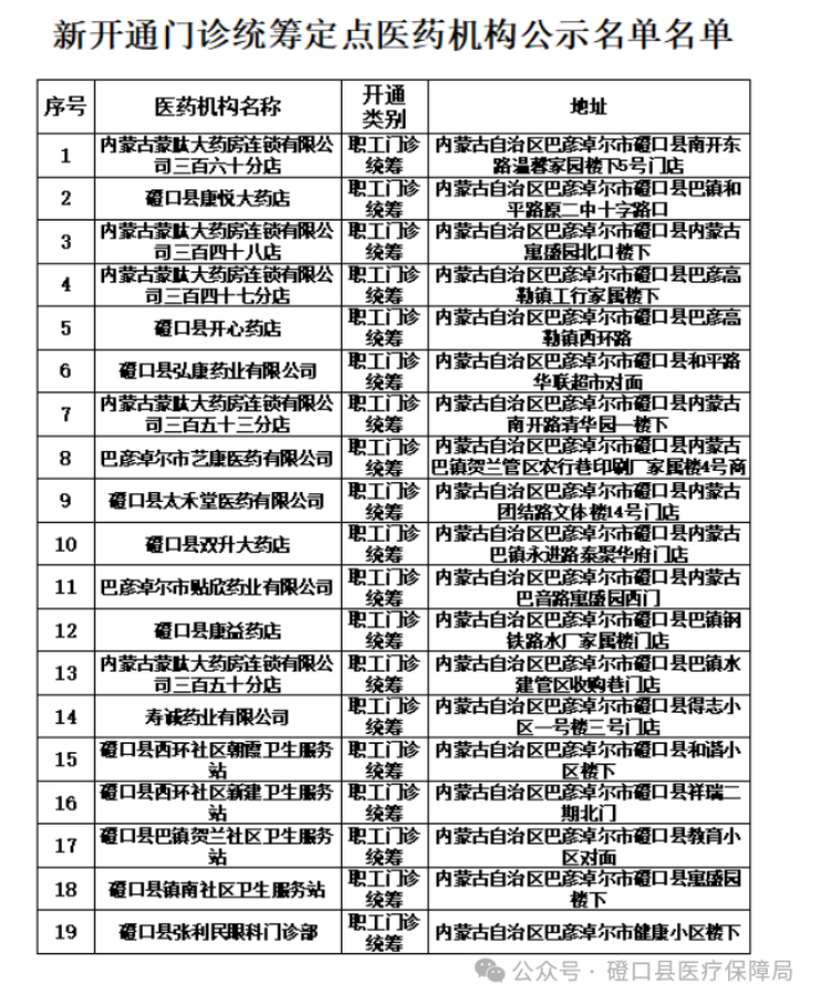 附件1:巴彦淖尔市磴口县新增开通门诊统筹定点医药机构公示名单