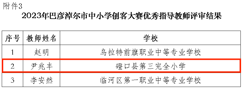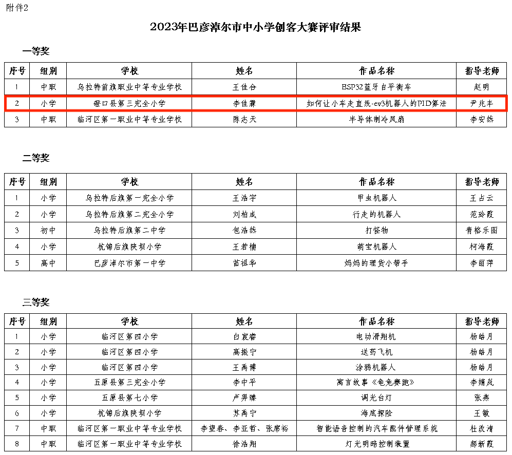 根据《关于开展2023年巴彦淖尔市中小学优秀自制教具评选、实验教学说课、学生创客大赛的通知》(巴教通字〔2023〕64号)要求,市教育局组织学科专家对旗县区和市直学校报送的187件教具作品,33件学生创客作品进行评审,共评选出自制教具一等奖17件、二等奖23件、三等奖64件;优秀学生创客作品一等奖3件、二等奖5件、三等奖8件和3名优秀指导老师,现予以公示。