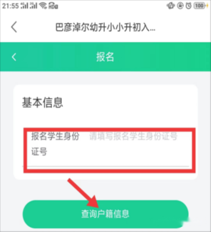 第二步:填写入学报名学生身份证信息进行学生个人户籍信息登记,准确填写学生身份证号码点击“查询户籍信息”。