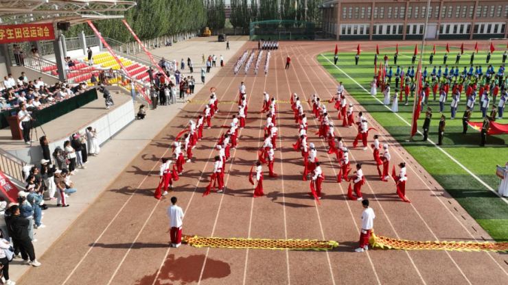 活动中,磴口一中体育特长班40名学生组成的表演队伍动作整齐划一,是团结协作精神的最好诠释,是青春活力的最好展现。实验小学表演队,国学武术操气势磅礴、浑厚有力,传递着中华民族的精神内涵,诠释盛世华章的壮丽与辉煌。二完小腰鼓队的同学们迈着整齐的步伐,踩着激昂的鼓点,挥舞着手中的鼓槌,尽显粗犷豪情。三完小的花样跳绳表演《绳采飞扬》,绳影蹁跹,绳采飞扬。实验中学表演队伍用自己的汗水和努力,诠释着青春的活力和奋斗的意义。