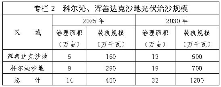 (二)总体目标。配合“三北”六期等生态治理工程,实施全区沙漠、沙地光伏治沙规模化开发,助力库布其沙漠、乌兰布和沙漠、毛乌素沙地等重点区域得到系统治理,科尔沁、浑善达克两大沙地可治理部分得到全覆盖治理,巴丹吉林、腾格里两大沙漠锁边工程加速推进,沙漠南侵趋势得到有效遏制。到2025年,光伏治沙装机规模超2140万千瓦,年发电量约360亿千瓦时,完成光伏治沙面积64万亩;到2030年,光伏治沙装机规模8900万千瓦,年发电量1500亿千瓦时,完成光伏治沙面积约230万亩,板下经济快速增长。