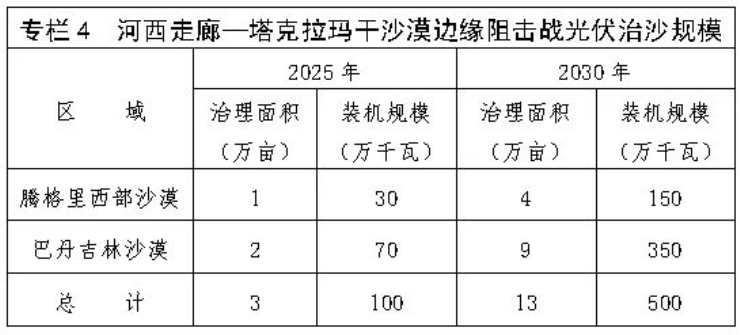 (三)推进林光互补的光伏治沙模式,助力打赢河西走廊—塔克拉玛干沙漠边缘阻击战。在腾格里西部沙漠、巴丹吉林沙漠及周边,避开高大密集型沙丘和沙丘链,采用抗扬沙、高效率的光伏技术集中连片布置光伏项目。到2025年建成光伏装机100万千瓦,到2030年建成500万千瓦。推广种植梭梭、驼绒藜等超旱生灌木,蒙古冰草等牧草,形成种植耐旱、固土的多年生草本植物为主的防风固沙治理模式。到2025年完成治沙面积3万亩,到2030年完成治沙面积13万亩。