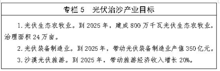 (二)推进以林光牧光相结合的光伏治沙模式,助力打赢黄河“几字弯”攻坚战。在毛乌素沙地、库布其沙漠、乌兰布和沙漠、腾格里东部沙漠及周边,采用适应干旱、半干旱环境的抗沙尘、高效率光伏技术路线,统筹光伏开发、生态旅游、工业园区等分区域用途管理,对较集中区块进行光伏规模化开发,在沙漠、沙地边缘居住区进行光伏分布式开发。到2025年建成光伏装机1590万千瓦,到2030年达到7200万千瓦。推进种植耐旱、固土的多年生草本植物,在有条件的地区探索种养结合模式,实现林光互补和牧光互补。到2025年完成光伏治沙面积47万亩,到2030年完成光伏治沙面积约185万亩。
