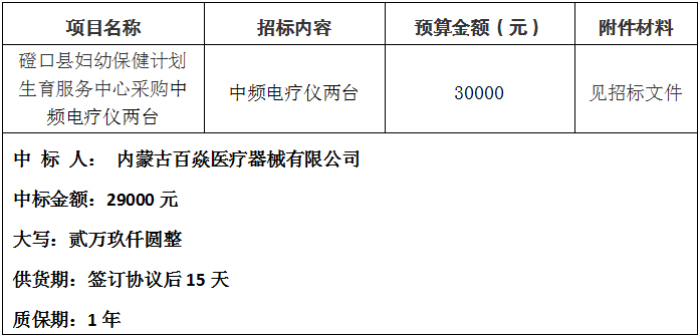 磴口县妇幼保健计划生育服务中心采购中频电疗仪两台(项目编号:DFYC2022004),于2022 年11月7日9时50分采用院内公开询价招标方式进行。现就本次询价采购成交结果公示如下: