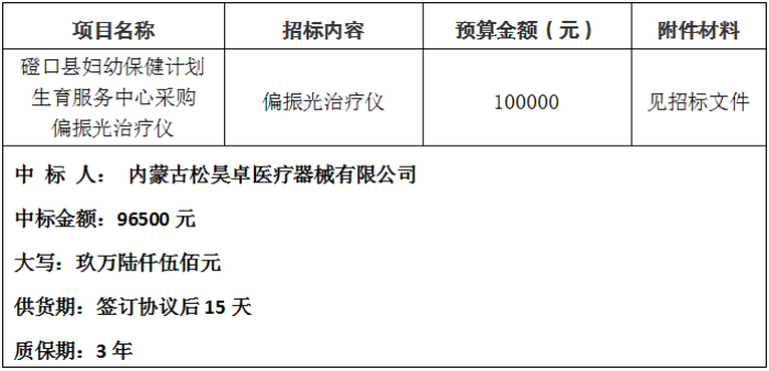磴口县妇幼保健计划生育服务中心采购偏振光治疗仪(项目编号:DFYC2022005),于2022 年11月7日9时50分采用院内公开询价招标方式进行。现就本次询价采购成交结果公示如下: