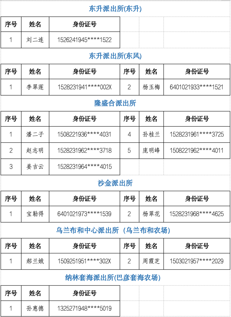 四、逾期处理:自通告发布后仍未主动到公安机关办理户口注销手续的,公安机关将按照自治区公安厅内通字(2024)90号文件《内蒙古自治区公安机关户口居民身份证管理工作规范》第八十二条规定:户口所在地公安机关经调查发现公民户口应当注销未注销的,在履行告知或公示程序后,可直接注销户口。注销户口如有疑义,经派出所调查发现注销错误,可申请恢复户口。疑似死亡未注销人员名单如下: