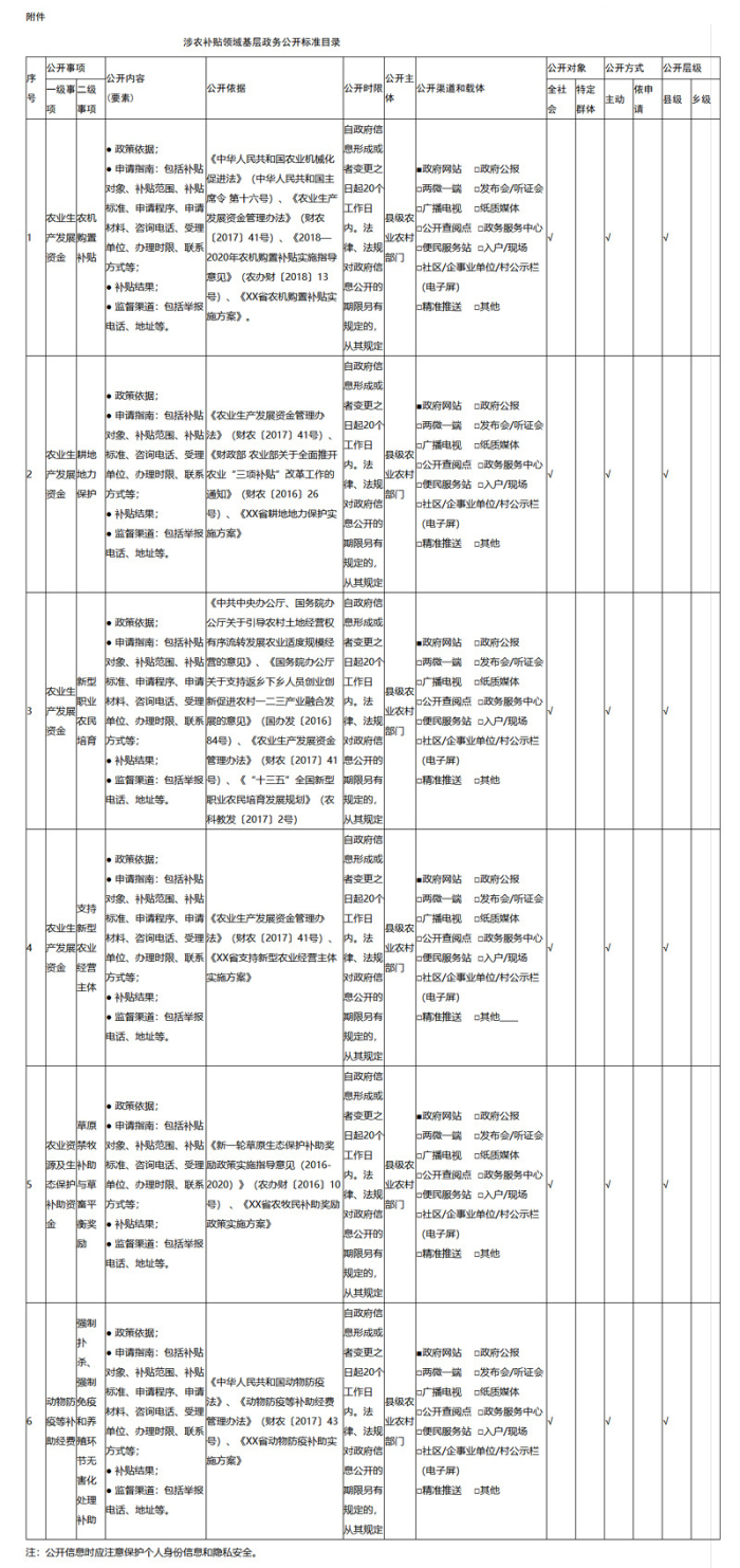 (二)公开事项标准。按照不同公开事项的特点,分别确定公开内容、公开依据、公开时限、公开主体、公开渠道和载体、公开对象、公开方式和公开层级(详见附表)。地方农业农村部门可在此基础上,结合具体工作进行细化补充和提升。公开信息应注意保护个人身份信息和隐私安全。