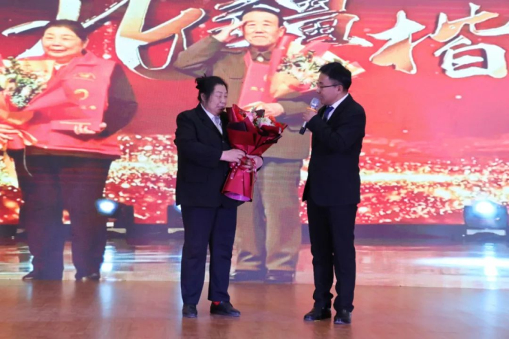 磴口县文联副主席王治贵为大家讲述“北疆楷模”、磴口县暖心志愿者协会会长郭翠梅大姐的先进事迹,并为大姐送上节日的祝福。