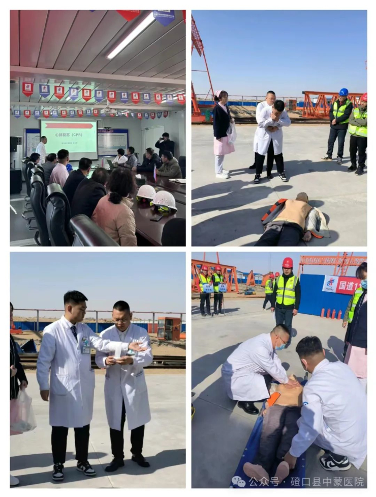 为进一步落实县委县政府关于优化营商环境的工作部署,提升服务能力,为打造优化营商环境提供有力的健康保障。3月13日,磴口县中蒙医院急诊科辛立明医生一行受邀参加新建110国道项目部(内蒙路桥20里柳子及中交二公司黄河大桥)开展应急演练并做急救知识培训。 以促进工人掌握自救互救知识和应急措施,进一步提高工人安全防范意识和自救互救能力,增强应对突发事件急救能力,全力保障工程顺利推进。