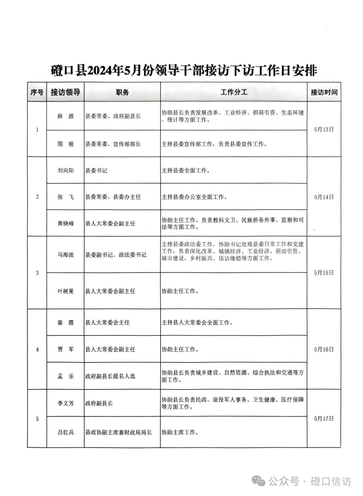磴口县2024年5月份领导干部接访下访工作日安排(5月13日-5月17日)