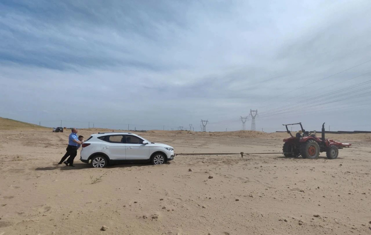 7月5日,正值夏季治安打击整治行动期间,磴口县公安局环食药侦大队民警下乡办案从沙金套海苏木返回磴口县时,看到路边的马女士正在路边招手求救。民警当即停车了解情况,得知马女士因路况不熟、经验不足、驾驶不当,导致车辆深陷沙地无法行驶。民警们经过不懈努力,用绳索、铁锹等工具将受困车辆成功拖出。马女士对民警真情助民的暖心表示感谢。临别时,民警提醒马女士,在外出自驾时,一定要注意观察道路情况,行驶时要减速慢行,确保安全驾驶。