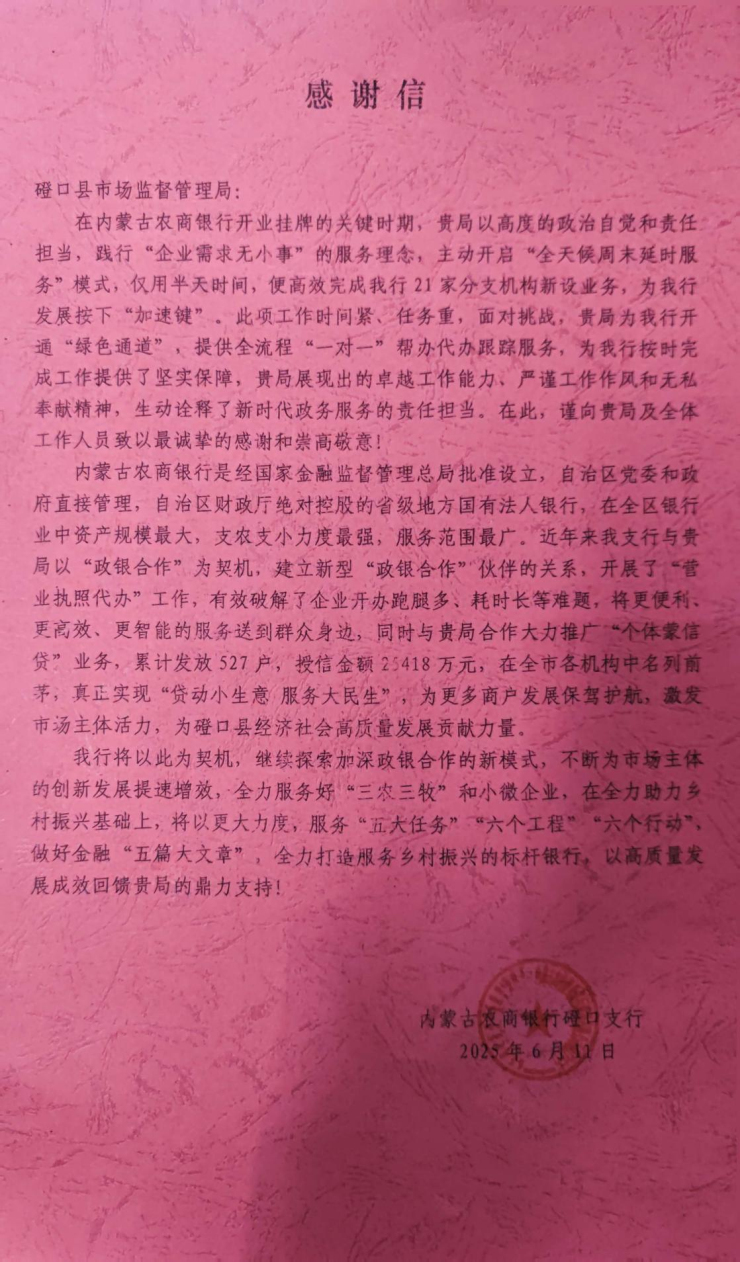 近日,一封饱含深情的感谢信送达磴口县政务服务大厅。信中,内蒙古农商银行磴口县支行高度赞扬了磴口县市场监督管理局综合窗口在为其21家分支机构高效办理新设业务过程中展现的“磴口速度”与“磴口温度”。