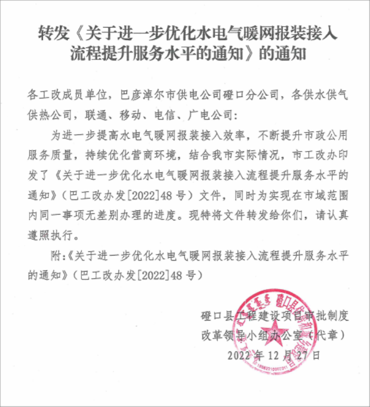 转发《关于进一步优化水电气暖网报装接入流程提升服务水平的通知》通知