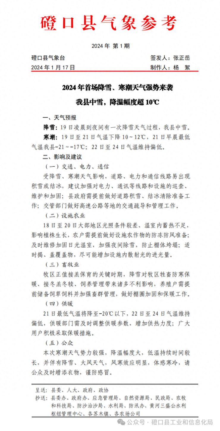根据自治区、市、县三级天气预报会商分析,预计我县将于1月19日凌晨2点开始降雪,并一直持续到1月19日夜间。全县大部中雪,雪后气温迅速下降,低温冰冻将持续一周左右。